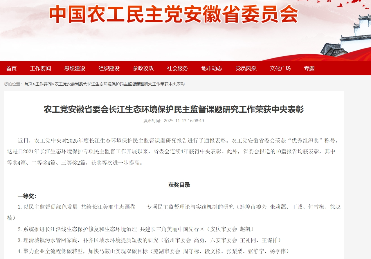 近日,农工党中央对2025年度长江生态环境保护民主监督课题研究报告进行了通报表彰。由我校2138CC太阳集团赵凯教授领衔的民主监督课题“系统推进长江沿线生态保护修复和生态环境治理 共建长三角美丽中国先行区”荣获一等奖。
