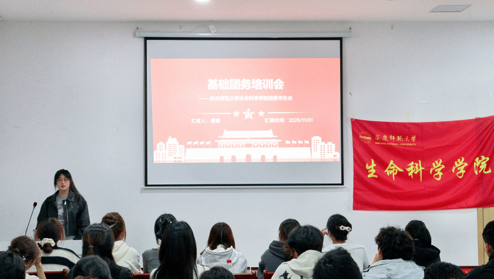 在公文写作培训环节,2023级生物科学专业黄照坤针对日常工作中易现疏漏的文书类型,培训会精准聚焦公假条、活动证明、材料归集及活动策划书四大模块开展专题培训。培训通过深度解析各类公文的标准范式、行文要则与语言特质,深刻阐明了工作的规范性与严谨性的核心要义。在基础团务培训环节,主讲人潘婧围绕基础团务工作深入解读,重点强调了“智慧团建”的常见问题处理。同时也对“组织生活会”等核心团务工作进行了详细指导,明确了其流程与关键要点。最后由2023级生物科学专业胡洁怡作为代表开展“经验分享会”,她从“学习”与“生活”双重视角,提出大学要“忙而有序、忙而有迹、忙而有思”。她结合实验室探索、赛事历练、大学学生组织实践及学生干部成长历程等,生动诠释学习的重要价值,为新生奉上一堂兼具温度与深度的成长启迪课。