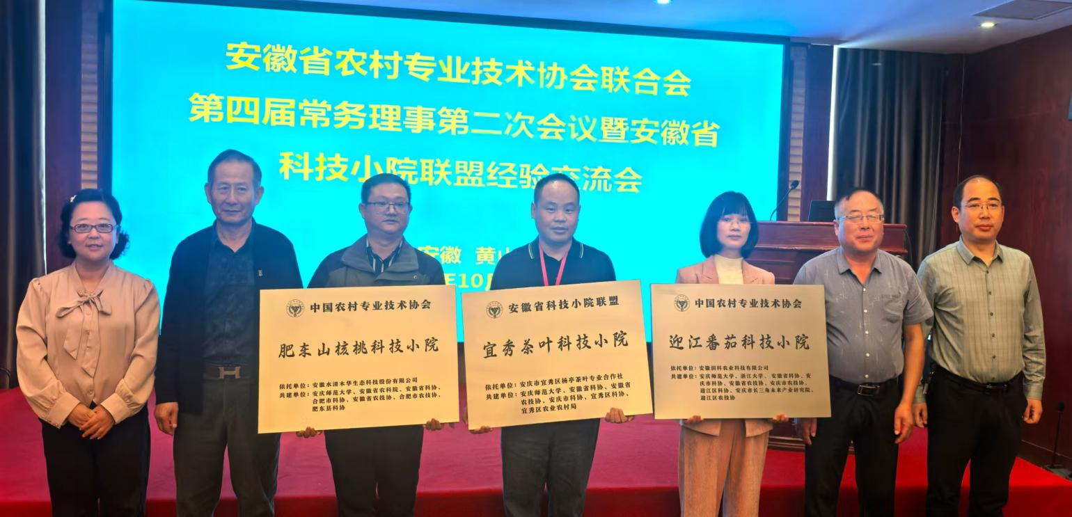 交流会上,对中国农村专业技术协会同意设立的安徽省30家科技小院进行了授牌仪式,其中,由我校牵头建设的“安徽肥东山核桃科技小院”和“安徽迎江番茄科技小院”被授予国家级科技小院、“安徽宜秀茶叶技小院”被授予省级科技小院。这是我校首次获批2个国家级科技小院和1个省级科技小院,是校深化人才培养改革、精准服务地方产业发展的新突破,成为学校服务大别山革命老区振兴“产教融合样板”。